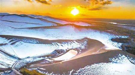 2月18日,雪后初霽。夕陽西下,敦煌鳴沙山月牙泉景區景色迷人。新甘肅·甘肅日報通訊員 王斌銀