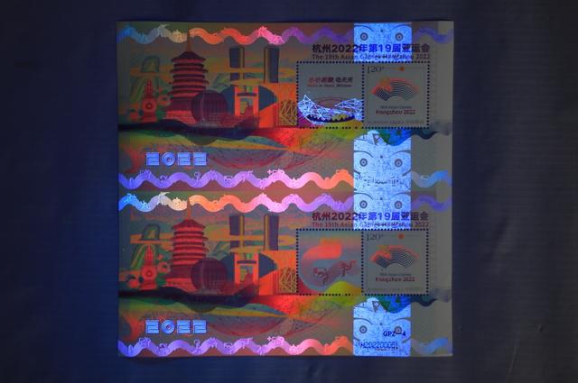 據(jù)了解,《杭州2022年第19屆亞運(yùn)會(huì)》特殊版式個(gè)性化郵票雙連張是中國集郵有限公司匠心打造的首款GPZ編號(hào)體育題材郵票,由青年設(shè)計(jì)師趙郁竹擔(dān)綱設(shè)計(jì),限量發(fā)行。它依托杭州亞運(yùn)會(huì)色彩系統(tǒng)和視覺形象元素,融歷史文化、現(xiàn)代美學(xué)和未來暢想于一體,集藝術(shù)感、科技感和運(yùn)動(dòng)感于一身,展現(xiàn)中華文明、浙江風(fēng)采、杭州韻味和時(shí)代魅力,采用特殊版式、編號(hào)和工藝,紫光燈下局部呈現(xiàn)無色熒光油墨圖案和全真彩效果,傳遞中國郵政對(duì)杭州亞運(yùn)的美好祝福。(圖片由人民日報(bào)客戶端提供)