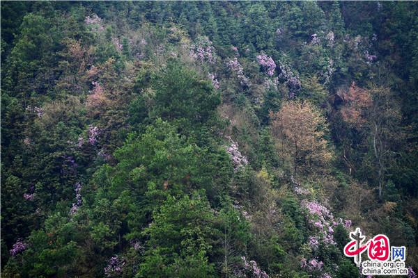 春天的穿巖山國家森林公園,漫山花開,層林盡染春色。這時候的野櫻花、野杜鵑、野映山紅竟相綻放,條條游步道宛如一條條花帶,帶著生機勃勃和滿天飄舞的芳香,讓游人心曠神怡。走在一條條蜿蜒的棧道,鮮氧環伺,鼻息間盡是春風吹來的清新氣息。這里人文歷史與自然美景交融,既可在蜿蜒的茶馬古道,重走紅軍路,感受偉大的革命精神,又可在越河而建、凌空百丈的5D玻璃橋體驗漫步云端的驚險刺激,還可在寧靜愜意的云端古村落,感受淳樸的民風和歷史悠長的農耕文化奇葩。早晨的日出云海,中午的藍圖白云,下午的燦爛夕陽,鮮花與藍天、彩霞相映,讓人流連忘返。漫山遍野的綠意間,成團櫻花、杜鵑、映山紅等夾雜其中,或粉紅或雪白,或紫色或丹紅,密密匝匝開滿枝頭。由于雪峰山景區的落差較高,從300米到1500米,櫻花期、杜鵑花期、映山紅花期交錯,成梯級往山背梯田景區、虎形山大花瑤綻放開來,讓賞花期能長達2、3個月之久。