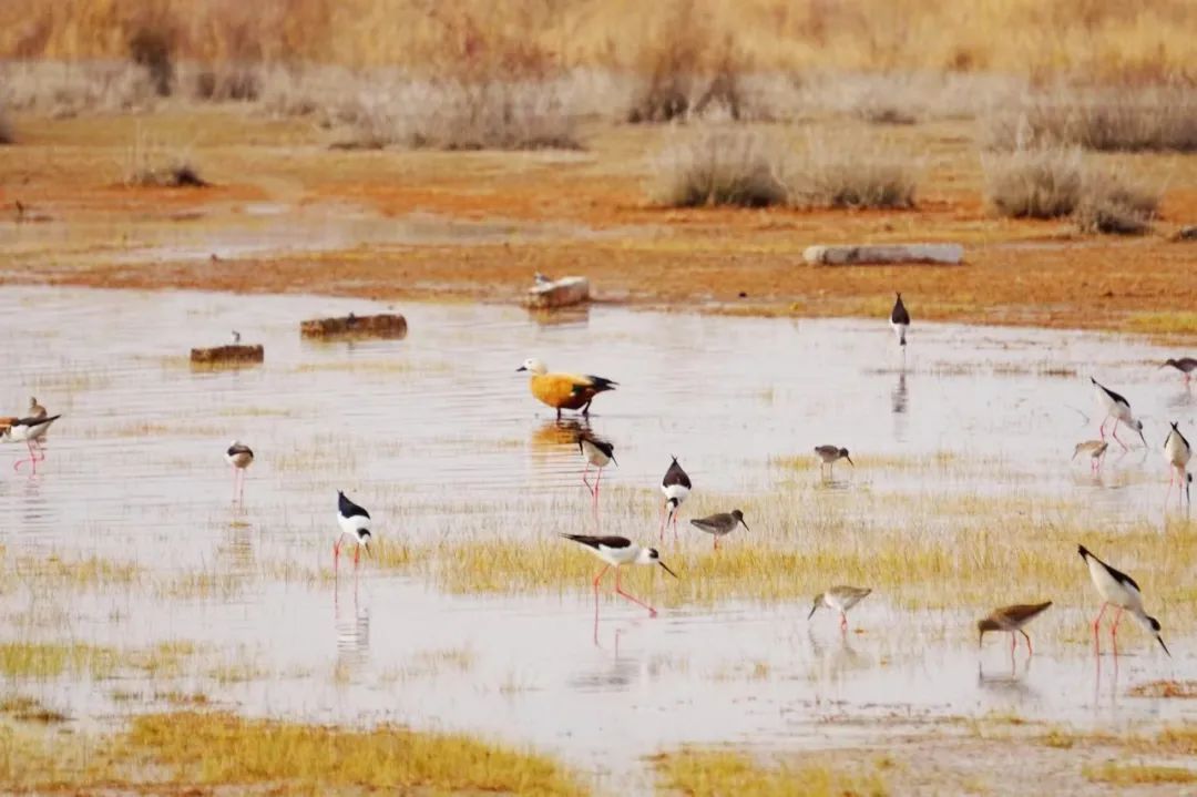 四月的敦煌大地春和景明,在庫姆塔格沙漠的邊緣,位于陽關濕地的壽昌海子波平如鏡,碧水映襯著祁連山上的雪峰,各種色彩斑斕地鳥兒仿佛收到了春天的邀約,在這里參加一場盛大的聚會。它們有的在湖面上引頸入水自在覓食,有的踏波翩翩起舞,有的追逐嬉戲鳴唱,有的在岸邊閑庭信步、悠然自得地曬太陽......構成了一幅多姿多彩的和諧自然生態畫卷。