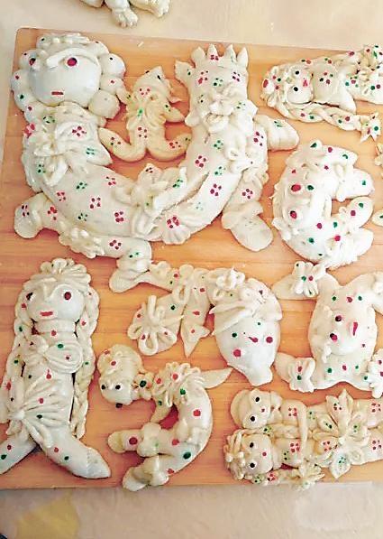 靜寧人的花饃饃,正是應和了消病消災、祈求平安的民間心理。端午禮儀中的面塑,表達著人們對美好事物的向往和祈禱。雖然是以食物的面目出現,但那些充滿靈性的造型,卻飽含著人文的意蘊。靜寧人塑成動物的面花中,最多的是蟾蜍和蛇。蛇面花多是盤成一團的,沒有攻擊性又溫和的樣子。蟾蜍面花本地人叫“癩呱子”,形象很可愛,多的是兩只后足弧形對稱,蜷在腹部兩側;兩只前足在頭頂相合,呈環抱姿態。也有別出心裁的婦女,會做出十二生肖之類的面花,這些面花,修飾并不夸張,其神韻更勝于外在的精致技巧。所有的端午面花都寄寓著大人們的祈福,但孩子們最喜歡的是動物面花,古靈精怪的,讓他們舍不得摸,更舍不得吃,只能與荷包一起掛在胸前賞玩,或與鄰家的小孩子一起比,看誰的媽媽手更靈更巧。