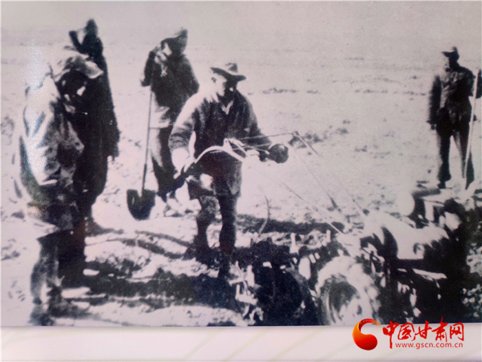 上個世紀40年代,山丹四壩灘上,山丹培黎學校農業組的學子在種地中學習,還實施了灌溉引水澆地。
