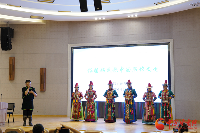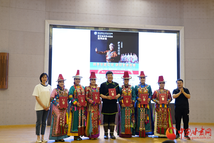 中國甘肅網7月1日訊 近日,甘肅裕固族歌唱組合薩爾組合主唱薩爾帶著他的裕固族伙伴們走進西北師范大學音樂學院,進行“課程思政教學實踐”——《裕固族民歌中的服飾文化》交流分享活動。同時,西北師范大學音樂學院副院長晏曉東為七位裕固族民間音樂傳播者頒發了音樂學院聘書。