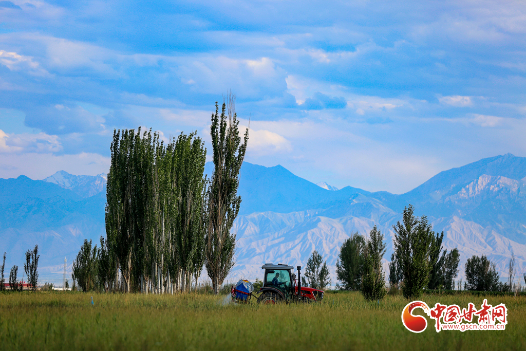 6月29日,在甘肅省酒泉市三墩鎮的田間地頭,處處可見村民們搶抓時節打藥除草、施肥扶苗的身影,茫茫田野呈現出一派忙碌的勞作景象。