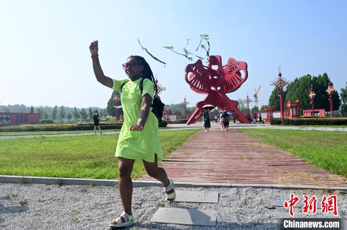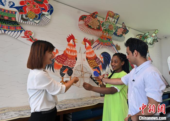 中新網廊坊7月21日電 (李玉素 宋敏濤)21日,來自河北師范大學的尼日利亞籍留學生馬臻和巴基斯坦籍留學生烏瑪爾,來到河北省廊坊市安次區第什里風箏小鎮,體驗中國傳統的風箏文化。