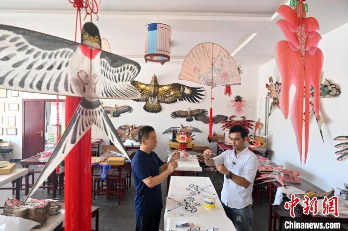 巴基斯坦籍留學生烏瑪爾(右)跟隨第什里風箏第五代傳承人趙艷強(左)學習傳統風箏制作。 翟羽佳 攝
