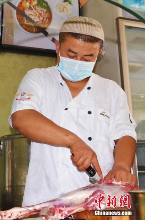 資料圖為8月12日,蘭州主城區某手抓羊肉招牌老店內,店員正在切新鮮的東鄉羔羊肉。 中新社記者 李亞龍 攝