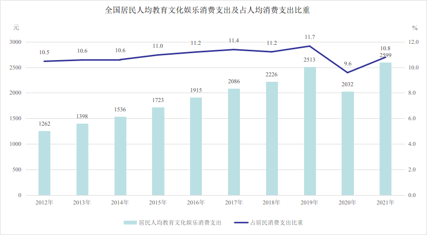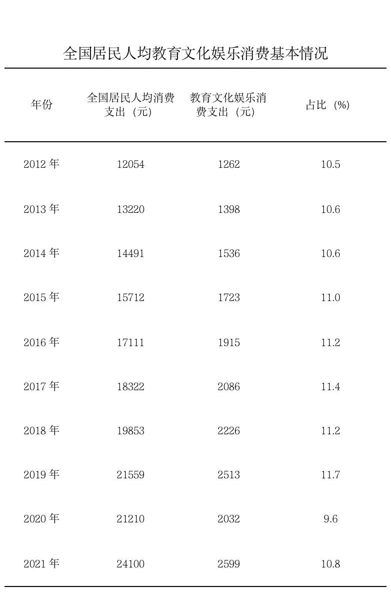 記者從文化和旅游部獲悉,十年來,文化產品和服務供給不斷豐富,促進文化和旅游消費取得顯著成效。2021年,全國居民人均教育文化娛樂支出2599元,較2012年增長105.9%。