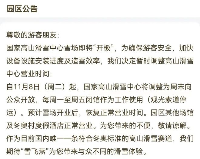 11月7日,據“北京延慶奧林匹克園區”小程序中發布的公告,國家高山滑雪中心雪場即將“開板”,為確保游客安全,加快設備設施安裝進度及造雪效率,決定暫時調整高山滑雪中心營業時間。這意味著,國家高山滑雪中心雪場將在今年冬天正式向公眾開放,開啟北京冬奧會的賽后利用新征程。