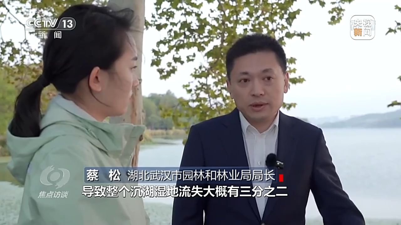 湖北武漢市園林和林業局局長 蔡松:圍湖造田、養魚,導致整個沉湖濕地流失大概有三分之二,比較嚴重。從2013年開始,武漢市加大對沉湖濕地的整治力度,通過生態補償的方式,整個退漁還濕達到了7.8萬畝。