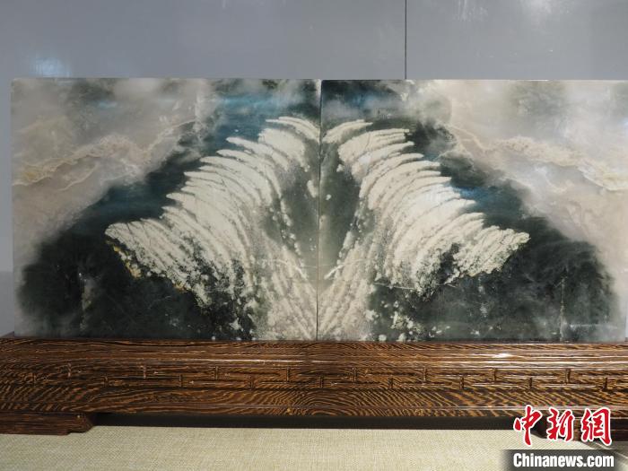 圖為現場展出的一塊奇石,其圖案有如瀑布飛流直下。李嬌陽 攝