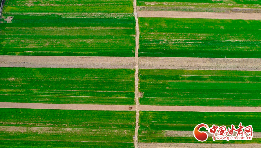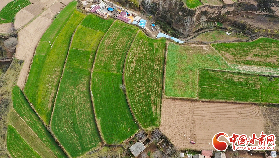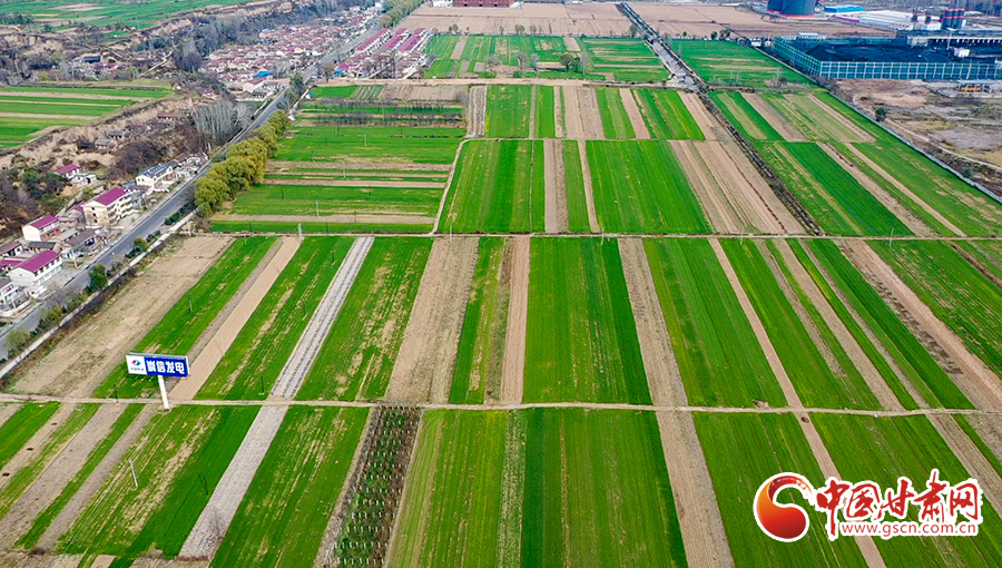 初冬時節,平涼市崇信縣錦屏鎮農田里冬小麥長勢喜人,從空中俯瞰,給田野鋪上了綠色的地毯。