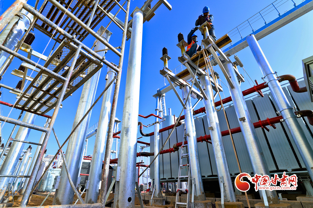 11月17日,甘肅省張掖市甘州區南灘中能綠電南灘30萬千瓦光伏建設現場,工人們正在進行變電設備安裝。