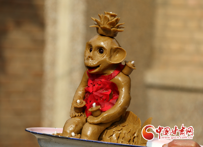 大面猴身上的面燈是專供一對新人來點的,所以面猴的做工尤為精心,在面猴的眼睛上還鑲嵌了明溜溜的黑豆,在胸前系著紅肚兜,看上去憨態可掬。