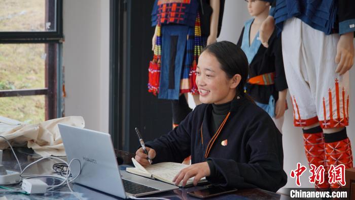 在朵努社區的織繡坊內,26歲的白褲瑤居民黎秋憶正在電腦前繪聲繪色地演講。此時的她正作為瑤族服飾非遺傳承人,參加廣西全區青年創業創新大賽。