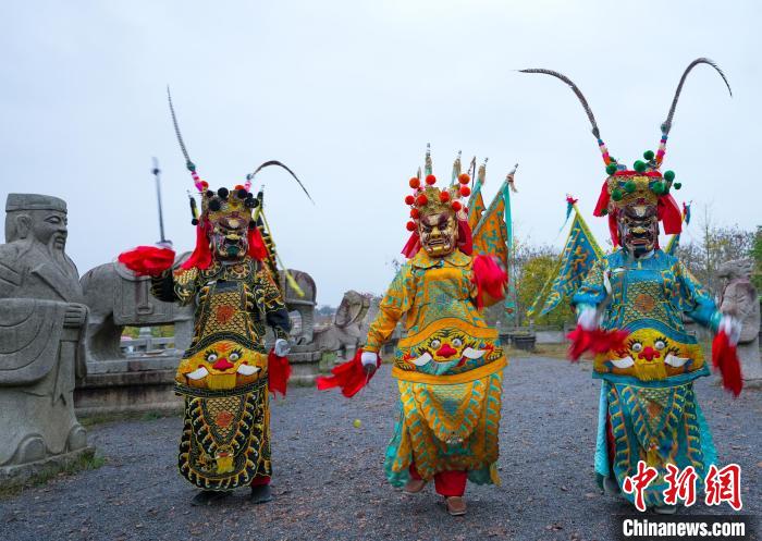 郎溪縣國家級非遺跳舞猖在郎溪縣濤城鎮(zhèn)慶豐村大佛山養(yǎng)心谷展演。 李曉紅 攝