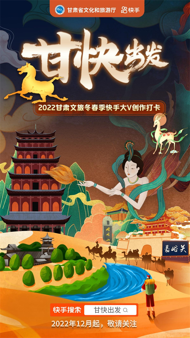 為加快推進全省文旅行業復工復產,激活冬春旅游市場,甘肅省文旅廳聯合快手科技舉辦的“甘快出發”2022甘肅文旅冬春季快手大V創作活動于12月16日啟動。本次活動整合快手文旅達人創作力量,10名來自全國的快手粉絲平均超過100萬的大V組建成“甘快出發”2022甘肅文旅冬春季快手大V創作采風團,于12月16日—31日分組分批次落地甘肅10城,以“狂想甘肅十大必體驗目的地”為品牌創作方向,進行甘肅文旅深度采風和短視頻內容制作,為網民呈現多元、細致、獨特的甘肅角度,打造獨有的“視頻甘肅”名片。