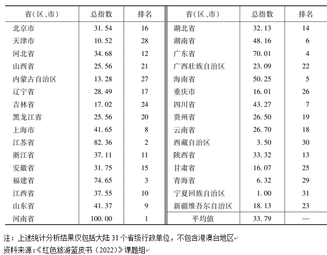 近日,北京第二外國(guó)語(yǔ)學(xué)院旅游科學(xué)學(xué)院與社會(huì)科學(xué)文獻(xiàn)出版社共同發(fā)布了紅色旅游藍(lán)皮書《中國(guó)紅色旅游發(fā)展報(bào)告(2022)》(以下簡(jiǎn)稱《藍(lán)皮書》)。《藍(lán)皮書》指出,中國(guó)紅色旅游發(fā)展水平持續(xù)提升,31個(gè)省級(jí)行政單位(不含港澳臺(tái)地區(qū))的紅色旅游發(fā)展指數(shù)排名中,位列前十的依次為河南省、江蘇省、福建省、廣東省、海南省、湖南省、四川省、上海市、山東省、江西省。