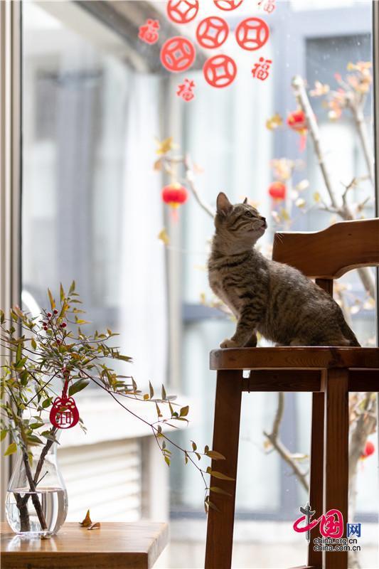 新剪的福字貼滿窗上檐下,人們隔著玻璃對望,會心一笑。