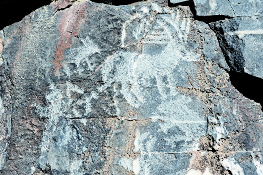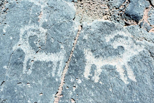 肅北縣大黑溝巖畫是全國重點文物保護單位,巖畫形成時間初步斷定在春秋、戰國至西漢時期,位于肅北縣城東約40公里處的大黑溝。巖畫共有34組,圖案190多幅,零亂分布在3.5公里長的山溝中,畫面內容多為射獵、放牧、練武、乘馬作戰等場景和北山羊、野牛、野駱駝等動物,畫面表現形式多以凹刻和凸刻,巖畫大多刻在避風向陽的陡峭花崗巖和石灰石上。