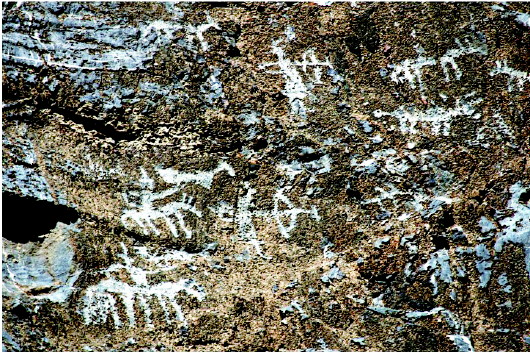 大黑溝巖畫從一塊不規則的平臥在溝壑間的大石上啟航。歷經自然變遷、歲月洗禮,一組組巖畫或懸于石崖半壁,或悄無聲息地沒入泥土,但依然見證著人類文明的輝煌。仿佛可以聞到一縷縷久遠的墨香撲面而來,讓人情不自禁翻開發黃的歷史長卷。