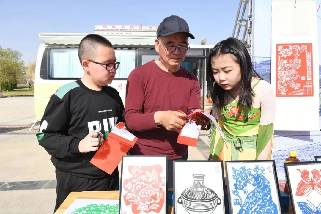 市級非遺保護傳承項目靖遠剪紙傳承人王世義正在教小學生剪紙。喬麗霞 攝