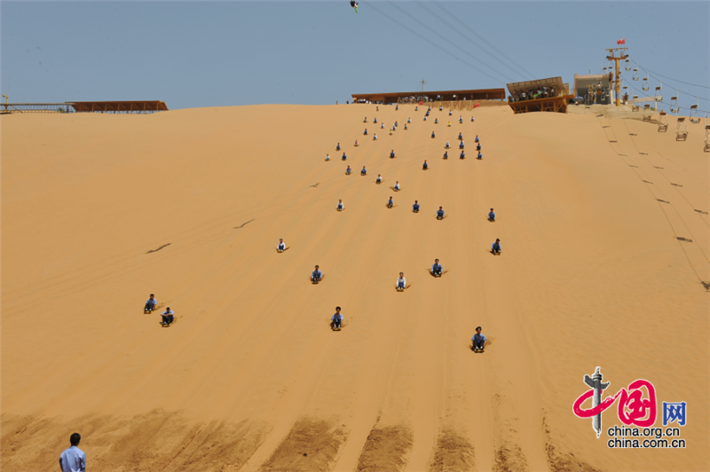 位于沙坡頭旅游區的中國國際滑沙中心,是西北地區最大的天然滑沙場,隆起100多米高的沙坡,筆陡如削,每到天晴沙漠曬熱時,人從沙坡滑下,會發出“嗡嗡”之聲,恍若鳴鐘,故有“沙坡鳴鐘”這一傳世勝景之名。