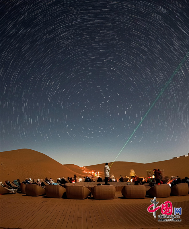 在沙漠區,游客晨觀大漠日出,昏賞沙海夕陽,夜晚宿在星星酒店,感受躺在床上看星星的奇妙體驗,在星咖啡手工制作星星原木版畫,在五行沙療室滋養生命的每一個細胞,在觀星谷跟著星空講師春看獅子座、夏觀銀河、秋尋仙女座、冬追獵戶座,期待與一場流星雨的不期而遇。
