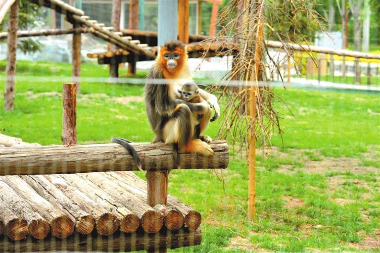 在珍稀動物區,同樣也是4月份出生的兩只小金絲猴好奇心很強,總想離開媽媽的懷抱去闖蕩世界,而猴媽媽則小心翼翼觀察周圍的環境,稍有響動就把猴寶寶攬入懷中,“寶媽”氣十足。
