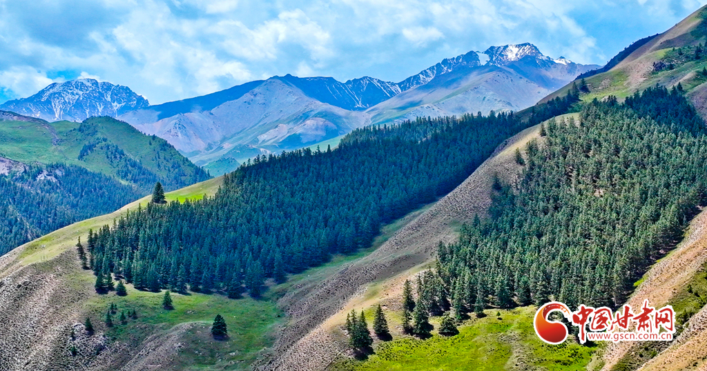 6月29日,在祁連山國家公園甘肅省張掖市肅南裕固族自治縣大河鄉段,藍天白云下,巍峨壯麗的祁連山蒼松翠柏,水光粼粼,構成一幅美麗的畫卷。