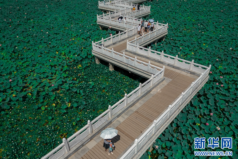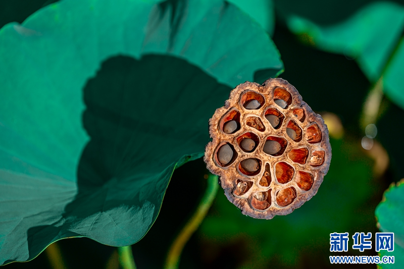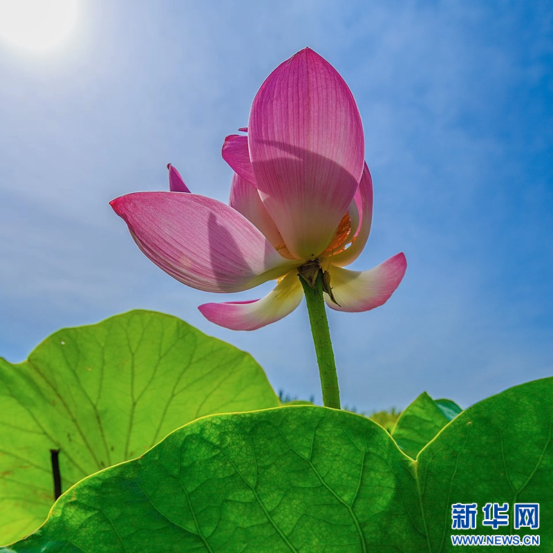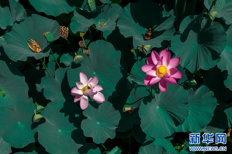 近日,在甘肅省白銀市白銀區水川黃河濕地公園,滿池荷花嬌艷、荷葉青翠,藍天、碧水、嬌花、翠葉構成了一幅秋日美景圖。新華網發(郭宏 攝)