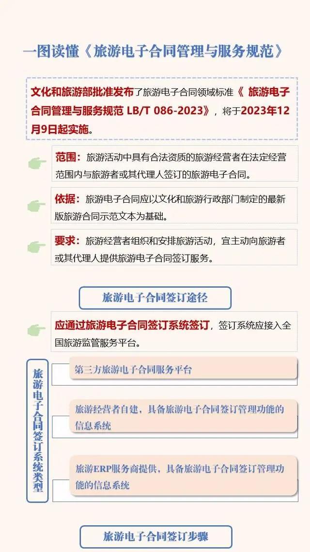 日前,文化和旅游部批準發布了旅游電子合同領域的行業標準《旅游電子合同管理與服務規范》(以下簡稱“標準”),將于2023年12月9日起實施。文化和旅游部正式發布該規范的解讀。