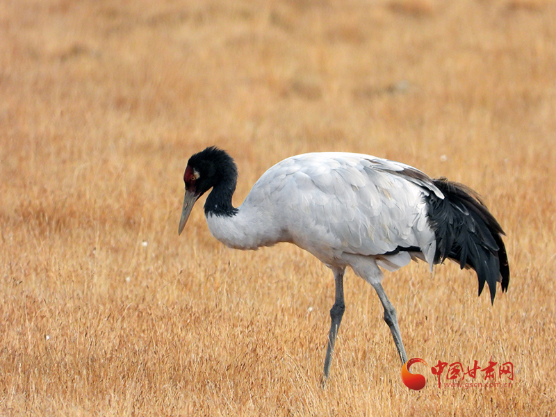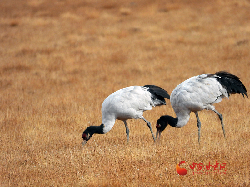 中國甘肅網10月17日訊 (西北角·中國甘肅網記者 張慧雅)近日,甘肅祁連山國家級自然保護區工作人員在轄區巡護時偶遇國家一級保護野生動物黑頸鶴歇息覓食的場景,兩只黑頸鶴漫步在一處濕地中一邊欣賞美景一邊享用美食。