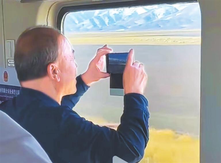 視頻中,一男子舉著手機,透過車窗面對著藍天、雪山、草原情不自禁地抒情:祁連山下,各族兒女兩千多年來在華夏的文明史上書寫了鞏固民族大業、實現祖國統一、民族繁榮的恢弘歷史。朋友們,來張掖!感受兩千年的絲綢之路,感悟現代的動車奔跑在祖國的大地上,讓中華在實現偉大復興的磅礴征程中恢弘勃發的新長征、新歷史。