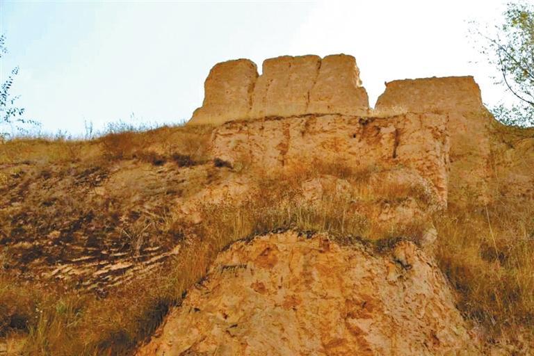在威戎鎮見到的第一處遺存,是位于威戎鎮廣場后的一處臺地。這一處遺存,是一段殘破的老城墻,以及一座形似堡樓的殘垣。站在臺地之下,仰望斷墻,人工修筑的痕跡十分明顯,層層黃土夯筑,因為廢棄殘破而長滿了荒草。走近堡樓,可以看見當時修筑時搭建木椽的孔洞,還有很多手掌大小的圓形石塊。