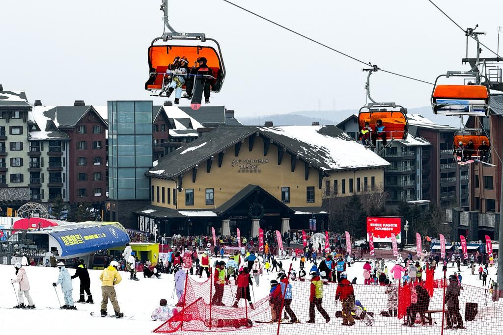滑雪愛好者在吉林省吉林市萬科松花湖度假區滑雪。新華社記者許暢 攝