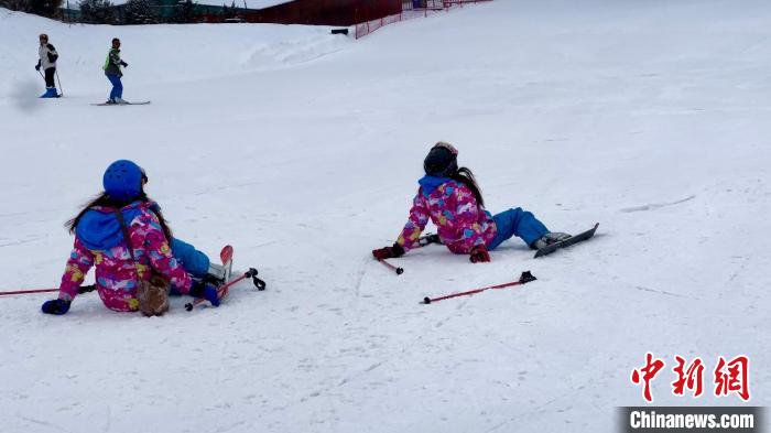 圖為臺胞青年滑雪摔倒瞬間。王牧雨 攝