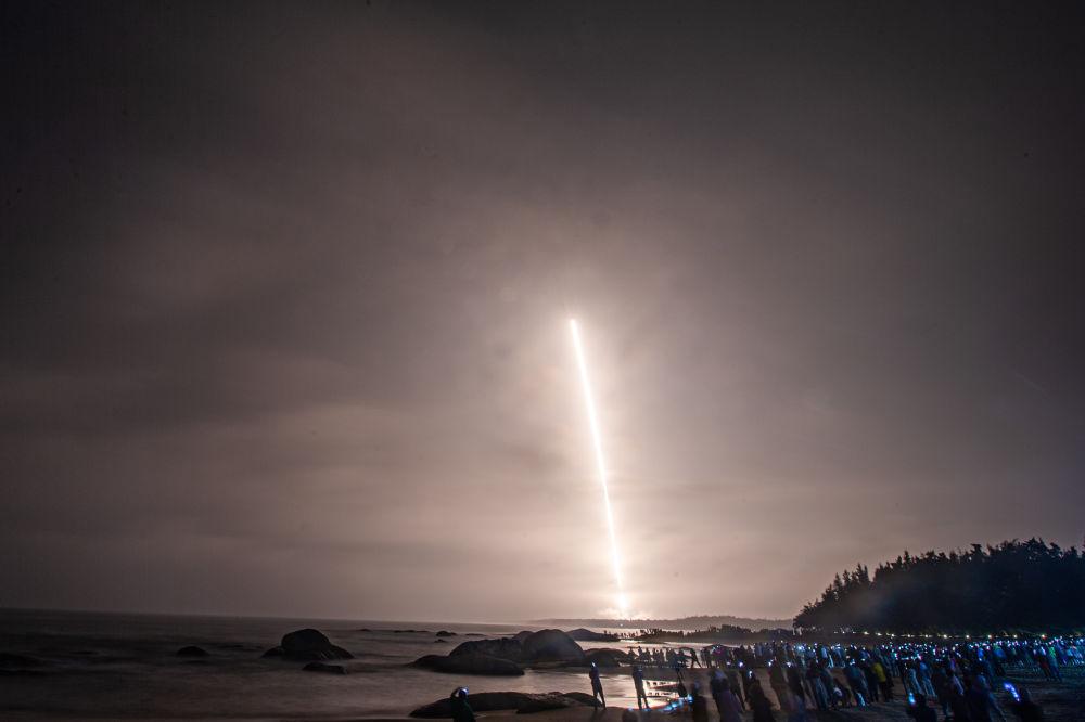 ↑長征七號改遙二運載火箭在海南文昌航天發射場發射,吸引眾多居民和游客在海邊觀看。新華社記者 蒲曉旭 攝