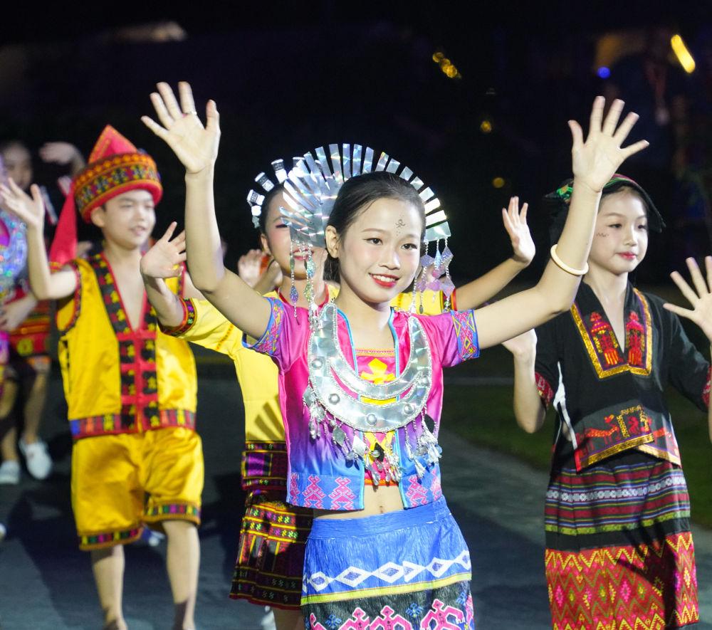 ↑2023年9月16日,海南省五指山市民族時裝“村秀”系列文化活動開幕。鄉鎮居民身著黎族、苗族傳統和創新設計服飾,向人們展示民族傳統文化的魅力。圖為展示服裝的小朋友與觀眾互動。新華社記者 樊雨晴 攝