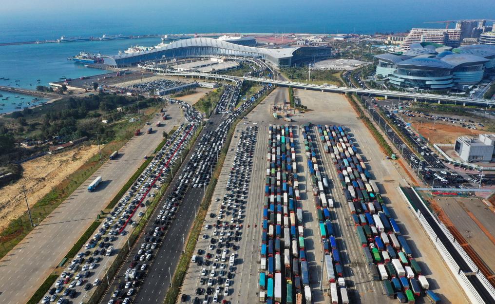 2月17日,大批車輛在海口市新海港等待登船(無人機照片)。新華社記者 郭程 攝