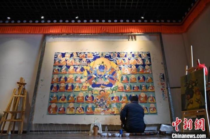 與外界慶祝節日的熱鬧“余溫”不同,25日,“世界藏學府”拉卜楞寺比鄰的唐卡小鎮,一間畫室內悄然無聲,唐卡師旦正嘉盤腿席地而坐,蘸取染料、勾線、上色,埋頭完成近整面墻高的巨幅唐卡。大大小小已完成的唐卡和各色顏料,填充了這所略大于教室的空曠房間。