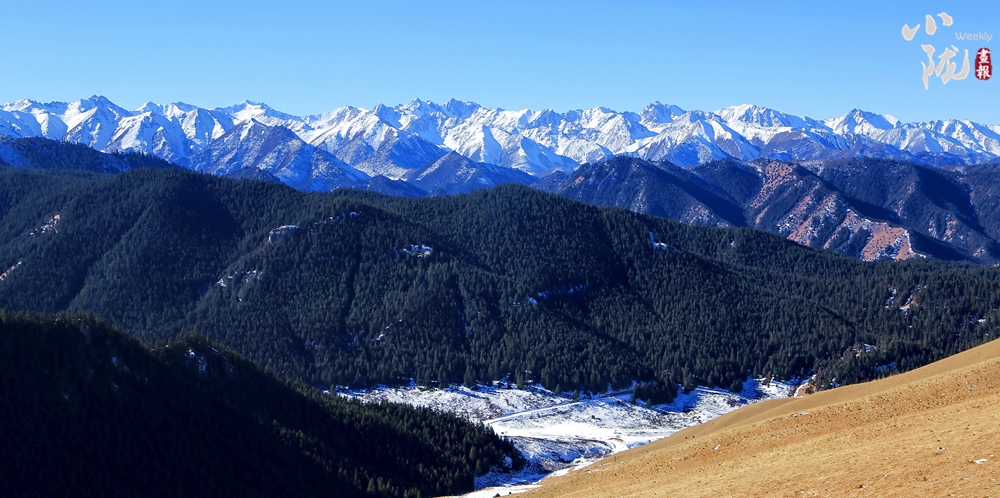 祁連主峰在藍天白云的映襯下顯得肅穆大氣。周圍群峰羅列、層巒疊嶂,高低延綿的山脈在陽光的照耀下交相輝映,近處的群山被此起彼伏的林海包圍,像一道道五彩的波浪,郁郁蔥蔥,生機盎然。