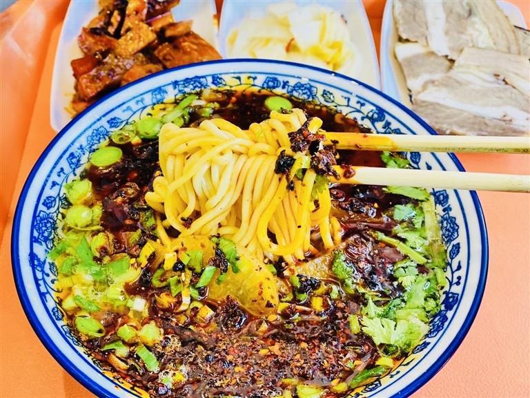 三月末的蘭州,天色尚未亮,蘭州城區千余家牛肉面館已開門營業。不少市民就來趕“頭鍋”,喚醒一天的精氣神。早上七八點,面館的人越來越多,大家排著隊,但并不需要等很久,稍等片刻牛肉面便出鍋了,熱氣騰騰,香氣四溢,吃起來更是回味無窮:面條筋道、湯汁濃郁。吃罷面,吹開面湯上紅紅的辣椒油,喝一口湯,滿福滴很!