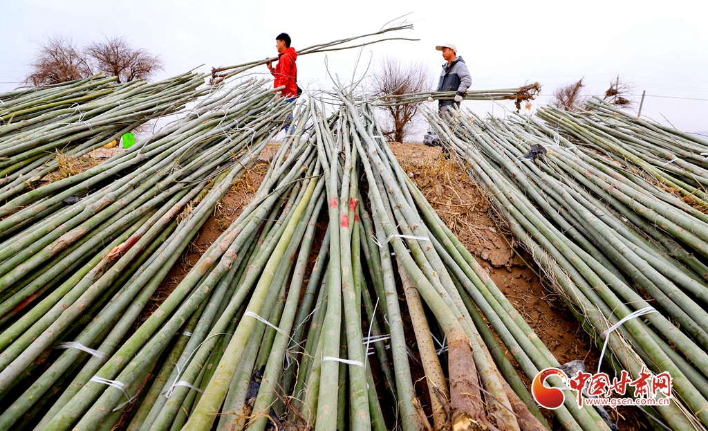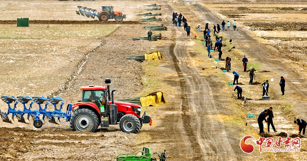 4月9日,甘肅省張掖市甘州區三閘鎮高寨村義務植樹基地上,千名當地干部職工和志愿者們揮鍬鏟土挖樹坑,掀起農田防護林建設和防沙治沙春季植樹造林熱潮。