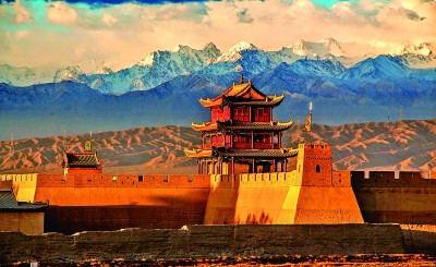 雄關(guān)六百載,長城越千年。看今朝,戈壁之上,嘉峪關(guān)關(guān)城的朱色城樓與終年皚皚的祁連雪峰交相輝映,歷經(jīng)風霜久而彌堅;峭壁之巔,長城第一墩矗立于此,腳下流淌的討賴河水澎湃不息;山脊之上,懸壁長城形似凌空倒掛,氣勢雄偉。
