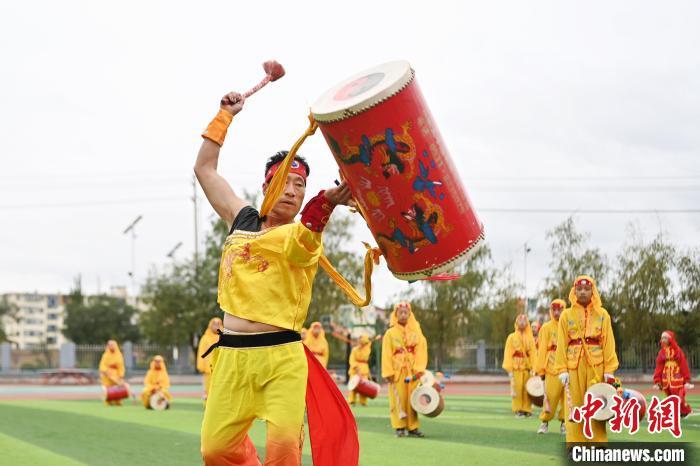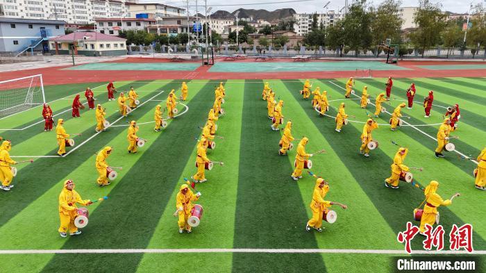 9月9日,甘肅省蘭州市皋蘭縣三川口學(xué)校學(xué)生練習(xí)蘭州太平鼓。中新社記者 九美旦增 攝
