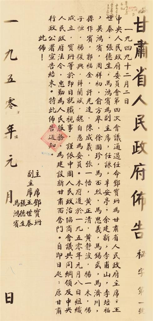 1950年1月,甘肅省人民政府頒發的第一號布告。