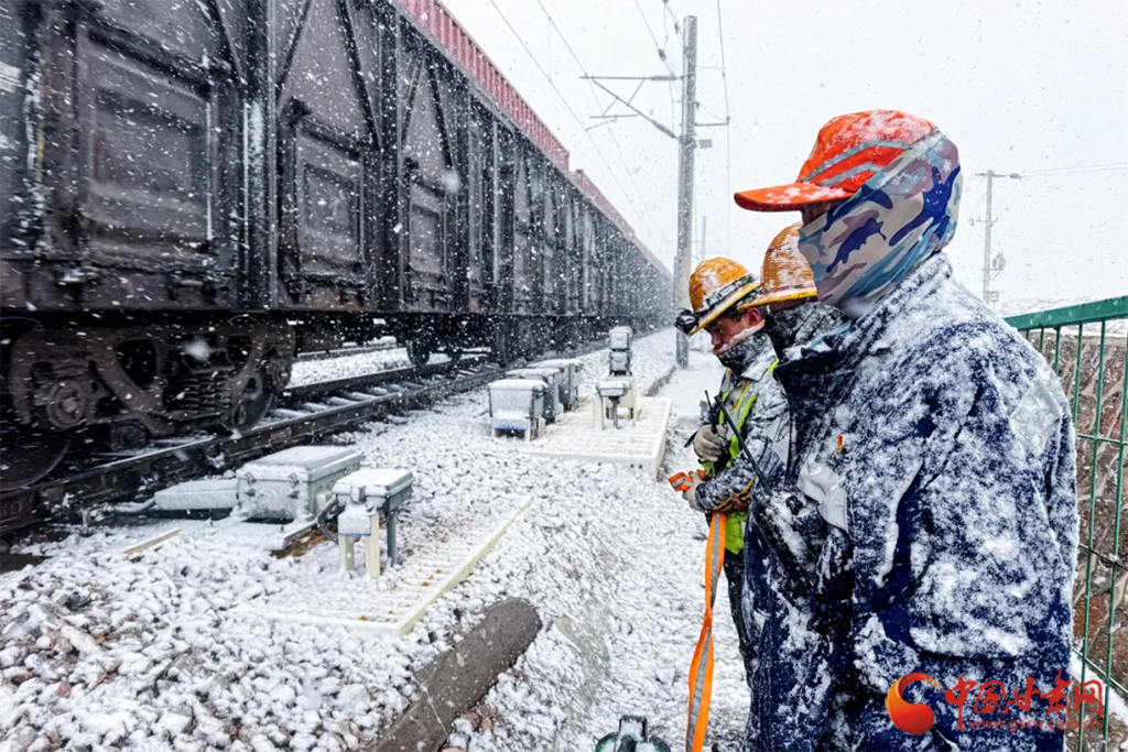 近日,受冷空氣影響,甘肅省古浪、山丹、永昌等地迎來降雪天氣。蘭州鐵路局各單位迅速啟動應急預案,上下聯動、多措并舉迎戰風雪,保障降雪天氣下運輸安全暢通。(蘭州鐵路局供圖)