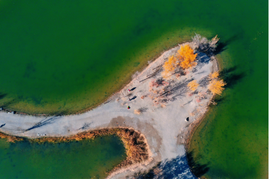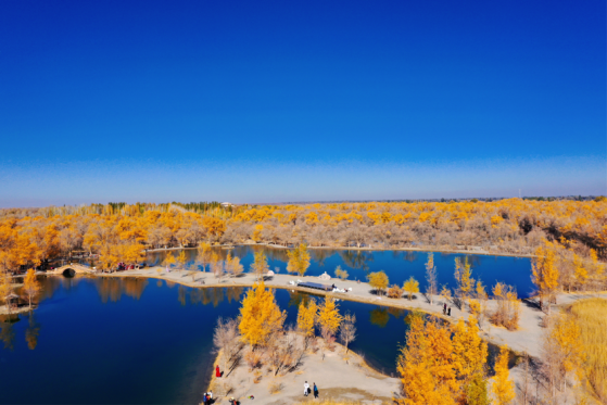 金波湖是金塔胡楊林的心臟,是臨水胡楊的最佳拍攝地之一。湖面倒映著胡楊高大的身影,多姿的樹干,黃色的樹葉,都毫不保留地在水中展示出來。小橋流水、碧波蕩漾、白鵝嬉戲,若不是周邊金黃色的胡楊提醒,會讓人誤以為來到了江南水鄉。
