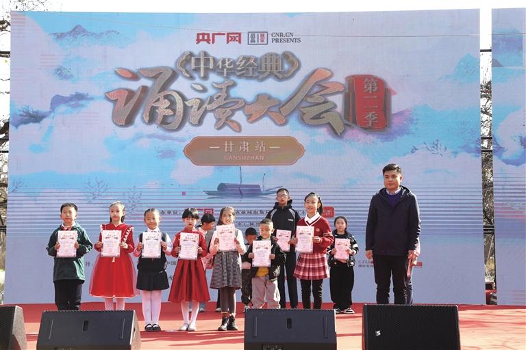 活動在鏗鏘有力的太平鼓聲中拉開帷幕,《滿江紅》《明月千里寄相思》《邊塞詩串燒》等詩歌朗誦依次上演,讓現(xiàn)場的觀眾沉浸在悠悠古韻中。歌曲《撒是蘭州》《不唱花兒心不甘》《推開甘肅的門》等為觀眾送上視聽盛宴,經(jīng)典名篇《黃河頌》的朗誦更是將現(xiàn)場的氣氛推向了高潮。本次“中華經(jīng)典誦讀大會”(第二季)甘肅站活動共設(shè)置萌新組、小學(xué)組、中學(xué)組、大學(xué)組、樂齡組、社會組6個組別,截至報名通道關(guān)閉,甘肅站報名人數(shù)達15714人,位列34個省(區(qū)、市)第三位。現(xiàn)場還為獲獎選手舉行了頒獎儀式。